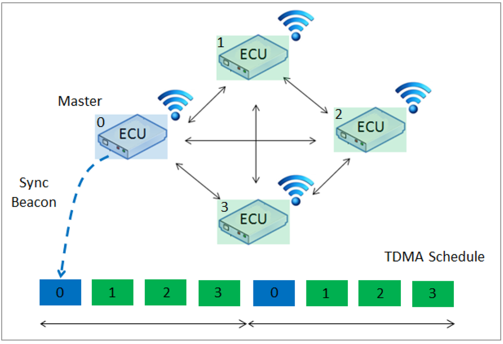 The nodes are connected in an ad hoc mode (Figure 3) using WiFi 802.11 g at 54 Mbps. To achieve communication synchronization among all of the nodes, a Time-Division Multiplexing Scheme (TDMA) is implemented. Each node has a unique ID number, which corresponds to the respective time slot allocated in the communication scheduler (off-line scheduler). Time synchronization is provided by assigning one node as the master node, which broadcasts a beacon packet in a predefined interval. All of the other nodes adjust their clocks upon receiving the beacon packet and wait until their preassigned time to transmit their data.