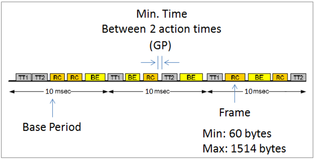 Figure 4 shows a typical TT TDMA frame. It consists of a Base Period (BP), the minimum time between two action times, also called the Guard Period (GP), and the frame or slot time ().