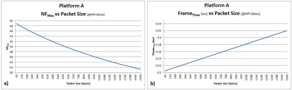 Platform A (a) vs. packet size (bytes) with BP = 10 ms and GP = 0.2 ms; (b) (ms) vs. packet size (bytes) with BP = 10 ms and GP = 0.2 ms.