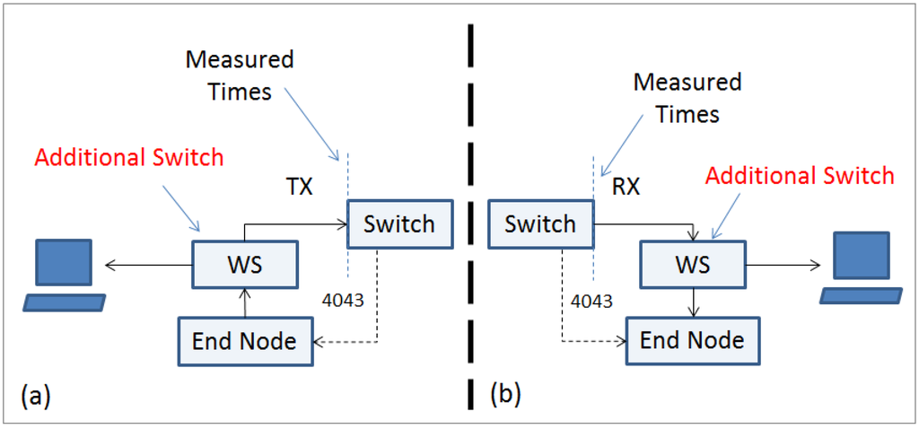 From Figure 10, the measured time (minimum or maximum) is related to the packet transmission time, but it does not include the time that the end node network device driver takes to pass and receive the packet to the physical layer. With this in mind, measurements are made in two parts.