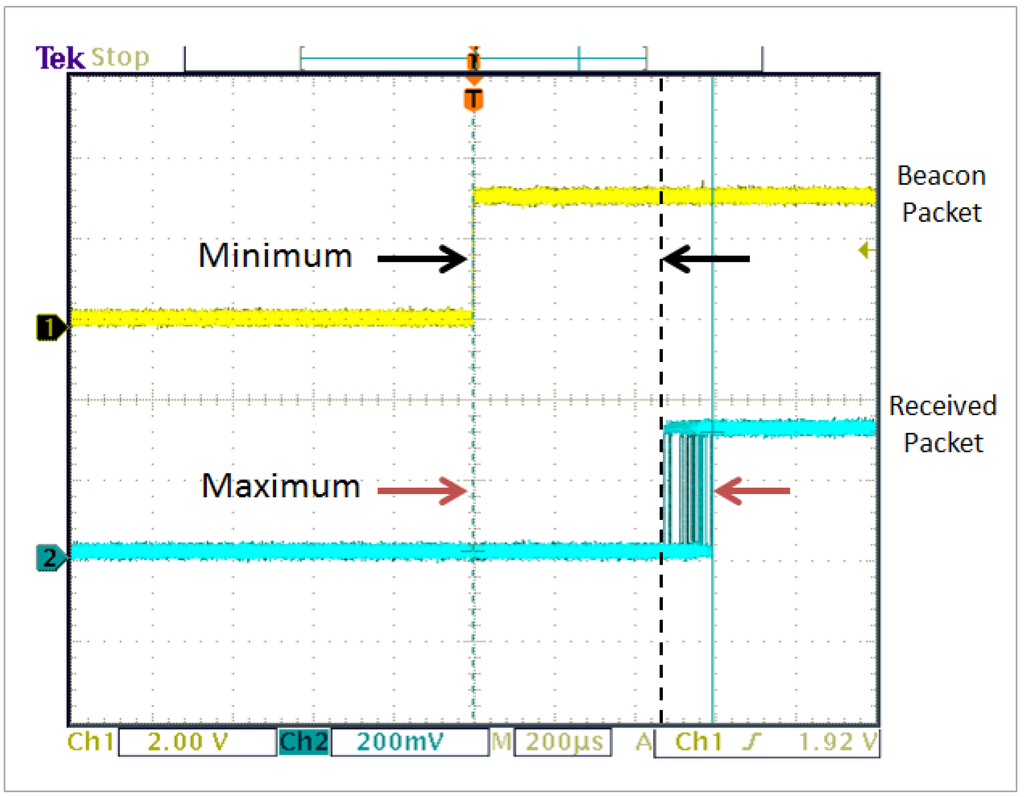 One node is assigned as the master node of the TDMA scheduler. The master node broadcasts a beacon packet (Tx) at a predefined interval (10 ms), and it toggles a pin to highlight the event. The remaining nodes toggle a pin upon reception (Rx) of that beacon packet. The packet transmission time is then measured by taking the difference between these two events. Figure 10 shows an oscilloscope measurement (60 bytes plus SHA-1 20 bytes tag = 80 bytes) of the packet propagation time.