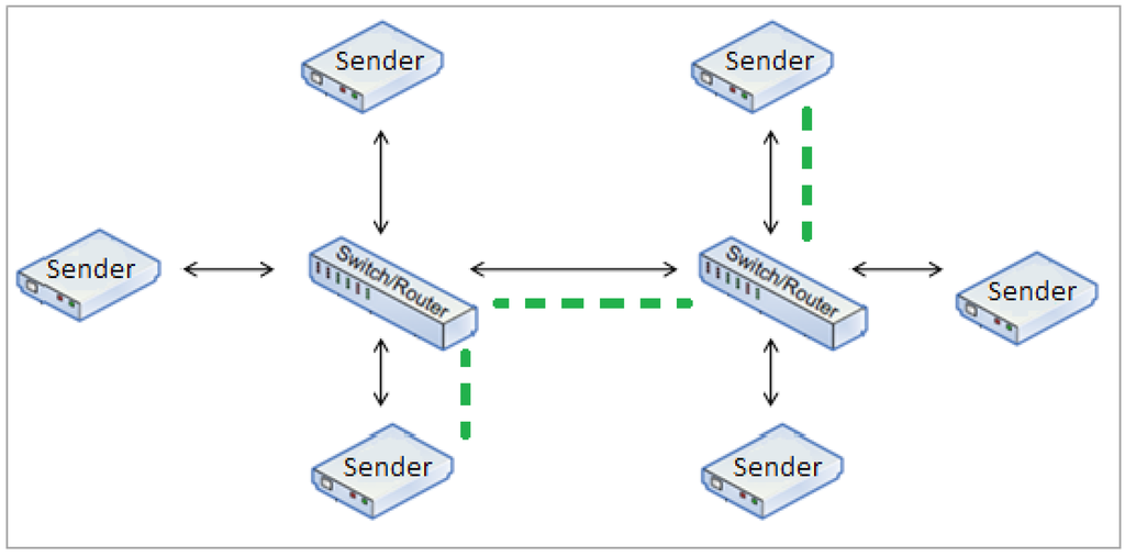 The first solution does not have an impact on the calculation of . As long as the switch has enough ports for the required number of end nodes, and the minimum guard period (0.2 ms) used to ensure that physical switch is fast enough to route one frame at its maximum size is the same, the calculation remains the same. However, this becomes an impractical solution, since every time there is a need to add more end nodes, the switch needs to be changed accordingly. The second solution is more practical, and it relies on connecting switches in a cascade topology (Figure 11).