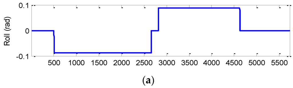 The three-dimensional vehicle trajectory for Scenario 2 is shown in Figure 10. Table 6 presents description of the three-dimensional vehicle motion. Figure 11 shows the Euler angles for the case of three-dimensional simulation. The trajectory for this example can be mainly divided into nine time intervals according to the vehicle dynamic characteristics. The vehicle was simulated to conduct constant acceleration and level flight from 0 to 250 s, counter-clockwise turns from 501 to 2310 s and clockwise circular motion from 2821–4630 s. In the three time intervals, highly dynamic maneuvering is involved. The constant-velocity straight-line flight is involved in all the other segments, where the low dynamic motion is considered.