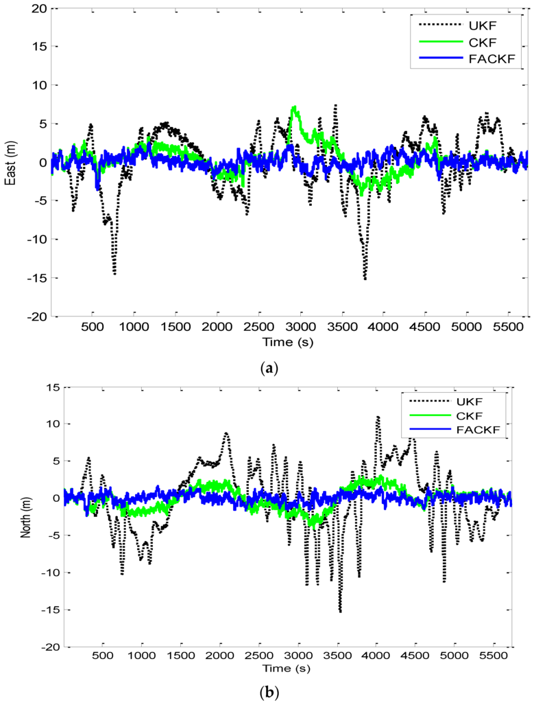 - During the time intervals the vehicle is conducting maneuvering, i.e., circular motion, turn motion, constant acceleration, or variable acceleration, the model mismatch to the actual situation leads to increased errors, as can be seen from the solution obtained by the conventional EKF. The CKF is about to converge in the high dynamic regions where there still exist noticeably large errors for the UKF-based solutions.