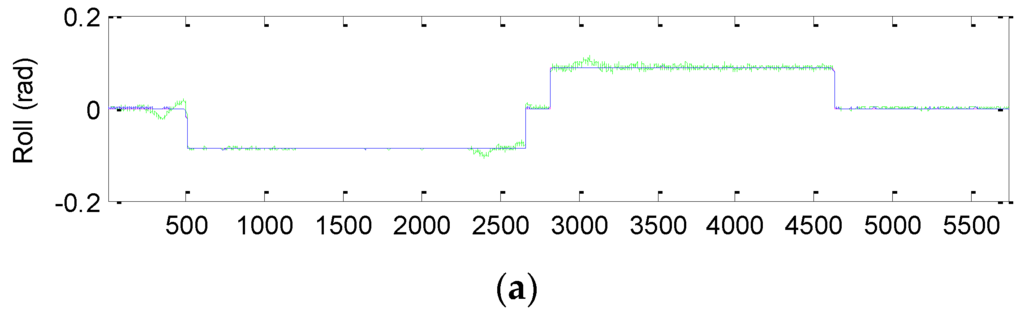 Comparison of Euler angle estimation results: UKF (in green) versus CKF (in blue)—Scenario 2. (a) Roll angle; (b) Pitch angle; (c) Yaw angle.