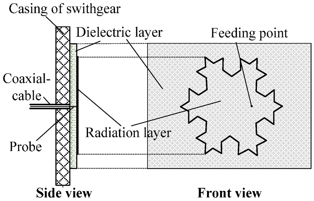 We observed the casings of high-voltage switchgear present large and flat features, although the high-voltage switchgear has a narrow interior space, complex components, and a compact structure. In this paper, a built-in UHF antenna sensor for high-voltage switchgear is designed, which adequately meets the high-voltage switchgear PD detection requirements. The casing of the high-voltage switchgear is initially used as the ground plane of the antenna sensor, and the antenna sensor is tightly attached to the inner wall of the high-voltage switchgear, which integrates the sensor into the switchgear. The antenna sensor diagram is shown in Figure 1. A microstrip antenna is adopted as a sensor prototype to achieve integration of the sensor and the switchgear. The microstrip antenna possesses a two-dimensional flat structure, which does not affect the internal electrical insulation environment. However, the narrow band of common microstrip antennas is a critical defect, and conventional methods for broadening the frequency band are inapplicable because of the internal space limitations in high-voltage switchgears, so the Koch snowflake patch is adopted as the radiation patch of the microstrip antenna, which can produce several resonant points to indirectly expand the antenna detection frequency band. As a result, it can greatly improve the PD detection performance of the sensor.
