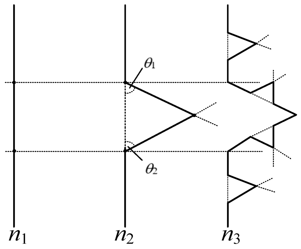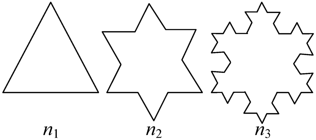 In this iterative process, line segment n1 is initially divided into three equal segments. Then, the middle line segment is removed and two new line segments are constructed through the two breakpoints, with the angles between the new line segments and the original segment being θ1 and θ2, respectively. The two segments intersect with each other to form a new curve n2. The same process is applied to each segment of curve n2 to obtain curve n3. In this fashion the higher-order Koch curve can be obtained. Considering the fact that θ1 and θ2 in the figure can be any value, the curve will have different shapes under different values of θ1 and θ2. In this study, θ1 and θ2 are both set to 60° to form the Koch snowflake structure. The iterative process is shown in Figure 3.