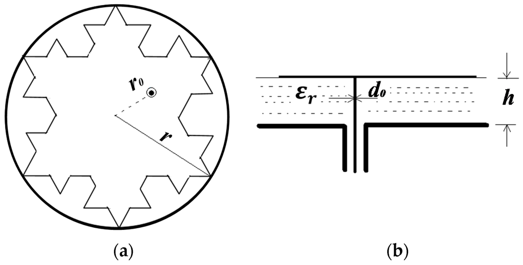 The relevant parameters of the antenna sensor are estimated by calculating the parameters of its circumcircle microstrip antenna. Then, these parameters of the antenna are optimized with the aid of a electromagnetic simulation software named Ansoft HFSS (Ansoft Corporation, Pittsburgh, PA, USA). The snowflake patch and its circumcircle with radius r are illustrated in Figure 4. Coaxial probe-feed is adopted, and the radius of the feed position and the diameter of the feed probe are represented by r0 and d0, respectively, while εr and h represent the relative dielectric constant and the dielectric layer thickness. The circular microstrip antenna is equivalent to an RLC resonant circuit (A circuit structure that is composed of resistance (R), inductor (L), and capacitance (C))according to circuit model analysis, as shown in Figure 5.