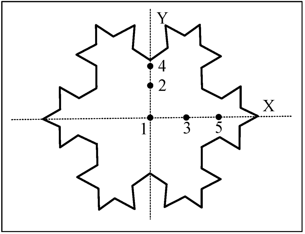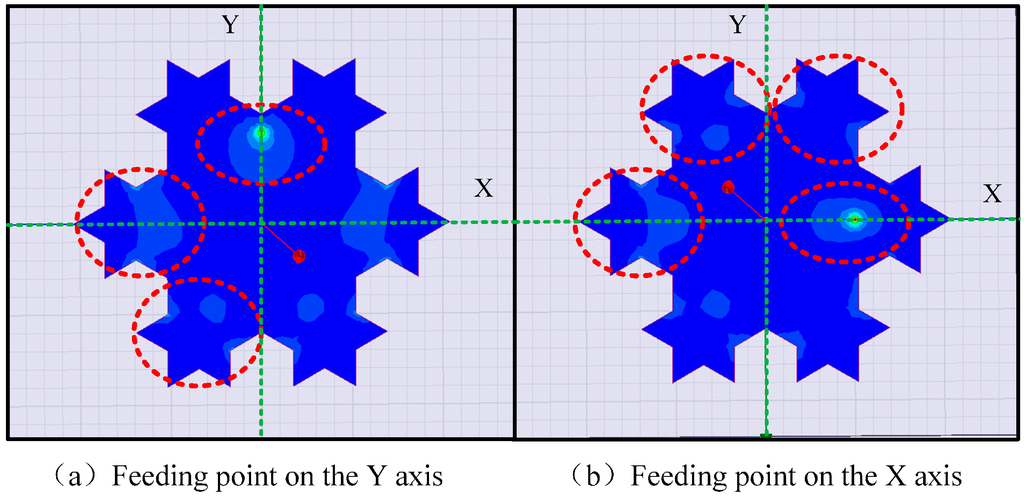 Considering the symmetry of the antenna, feed points are selected on its symmetry axis. Figure 6 shows two symmetry axes of the antenna, denoted as the X-axis and Y-axis. Five points (Points 1–5) are selected to be the feed points, which are used to analyze the main resonant frequency and impedance matching degree at different feed positions. Points 3 and 5 along with Points 2 and 4 are respectively located on the X-axis and Y-axis. Point 1 is located at the geometric center of the antenna.