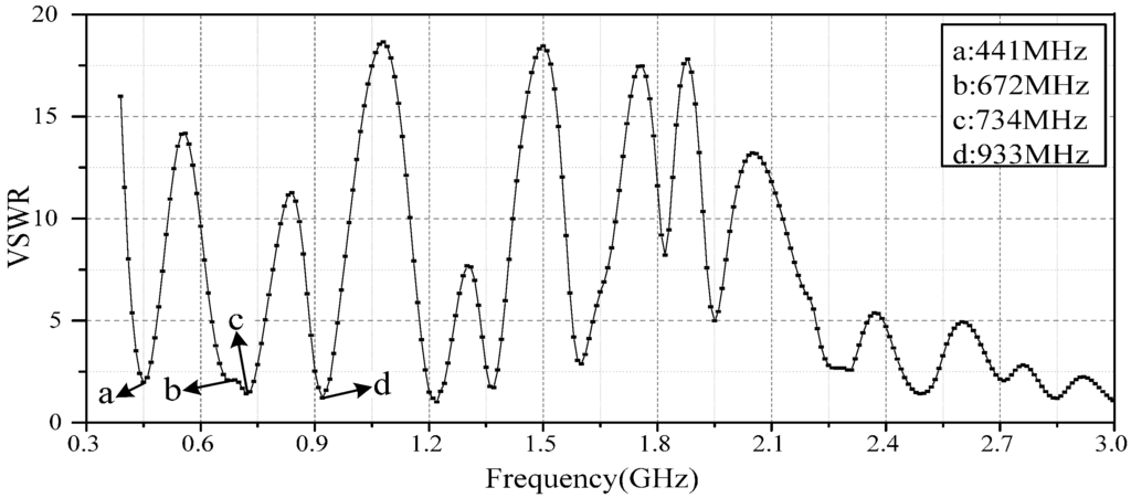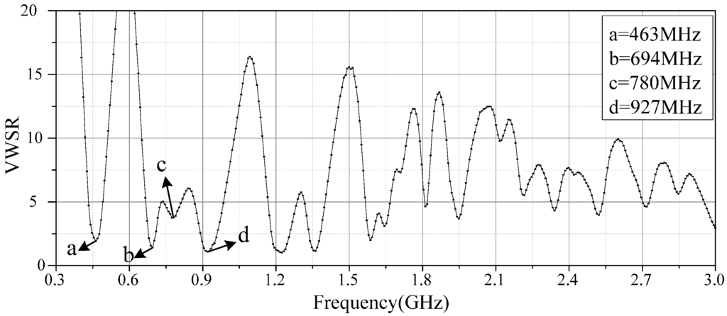 Next a built-in antenna sensor prototype is fabricated (Figure 10), and its VSWR is measured by a vector network analyzer (Anritsu 37369D, Kanagawa, Japan; frequency range from 20 MHz to 40 GHz) to verify the accuracy of the antenna sensor simulation results. The measured VSWR is shown in Figure 11, and the results indicate that the antenna sensor presents good multi-frequency performance. The four resonant points in the low-frequency band are 463, 694, 780, and 927 MHz, and their corresponding VSWRs are 1.911, 1.419, 3.754 and 1.122, respectively. This result also shows that the antenna possesses multiple resonant points from 1 GHz to 3 GHz. Therefore, it can be concluded that the measurement results basically accord with the simulation results.