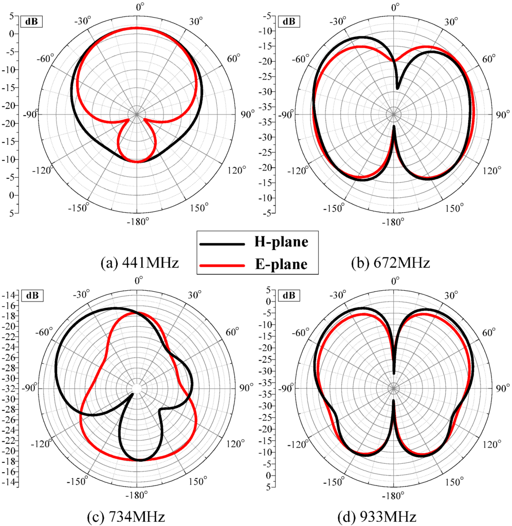 The ability to receive signals from different directions is important for the built-in antenna sensor, because the antenna sensor is tightly attached to the inner wall of the high-voltage switchgear. Therefore, the radiation direction of the four resonant points is analyzed in this study. Figure 9 shows the E-plane and H-plane antenna radiation patterns for four resonance frequencies.