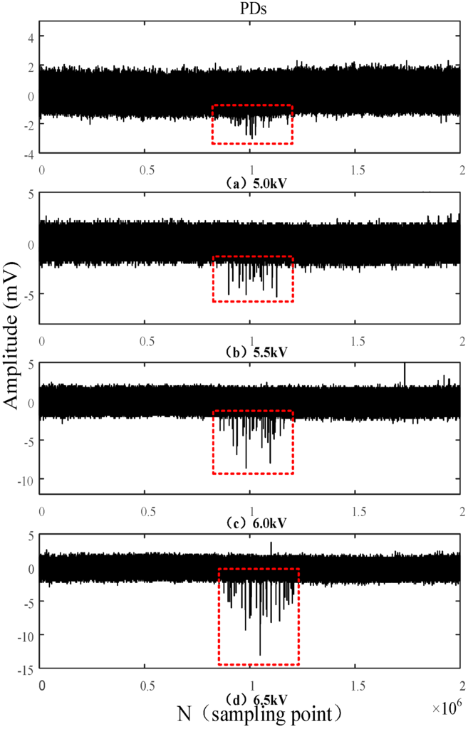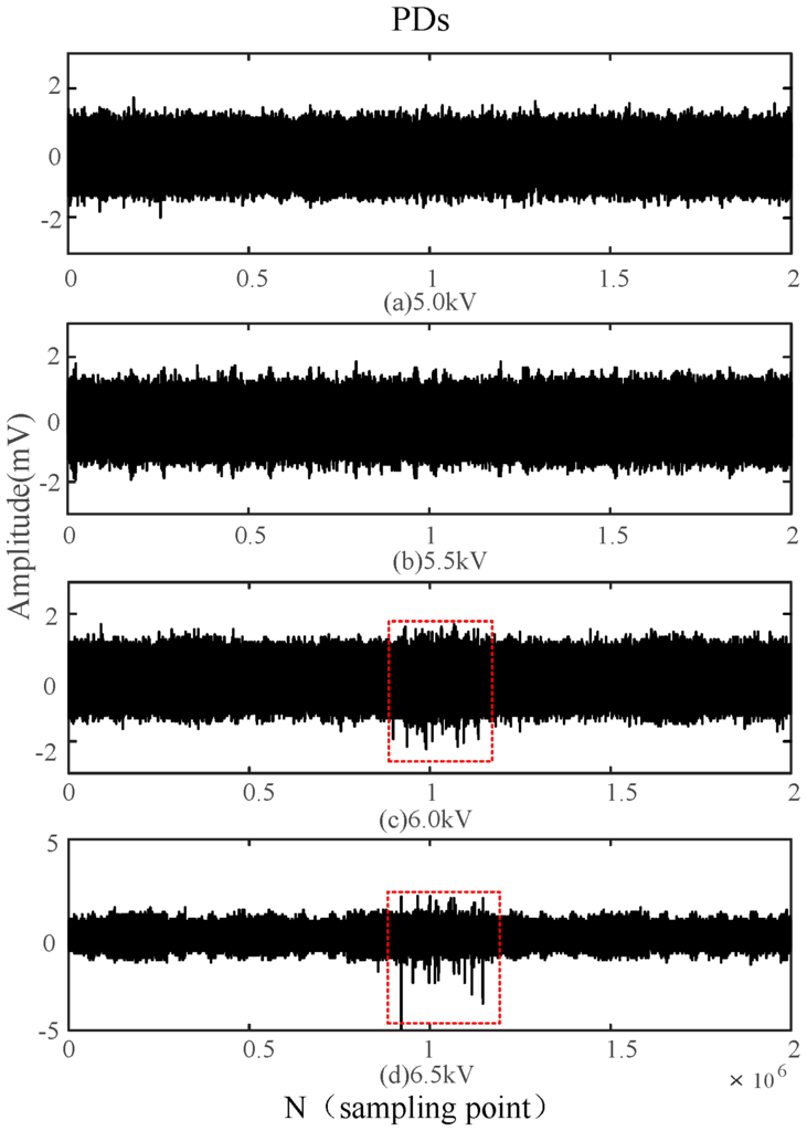 In order to assess the detection performance of the built-in sensor and verify its superiority, the PDs with a power-frequency cycle (20 ms) are analyzed under different voltages, with a sampling frequency of 100 MHz. Figure 14 and Figure 15 show the waveforms of PDs detected by the built-in antenna and the external antenna for different voltages, respectively.