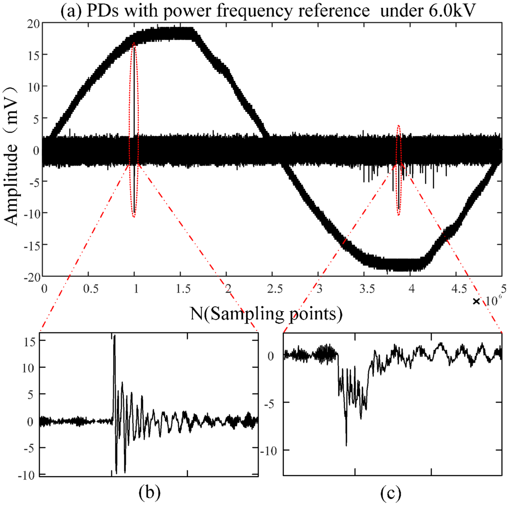 (a) PDs with frequency reference under 6.0 kV; (b) The enlarged view of PDs occurring in the positive half-period; (c) The enlarged view of PDs occurring in the negative half-period.