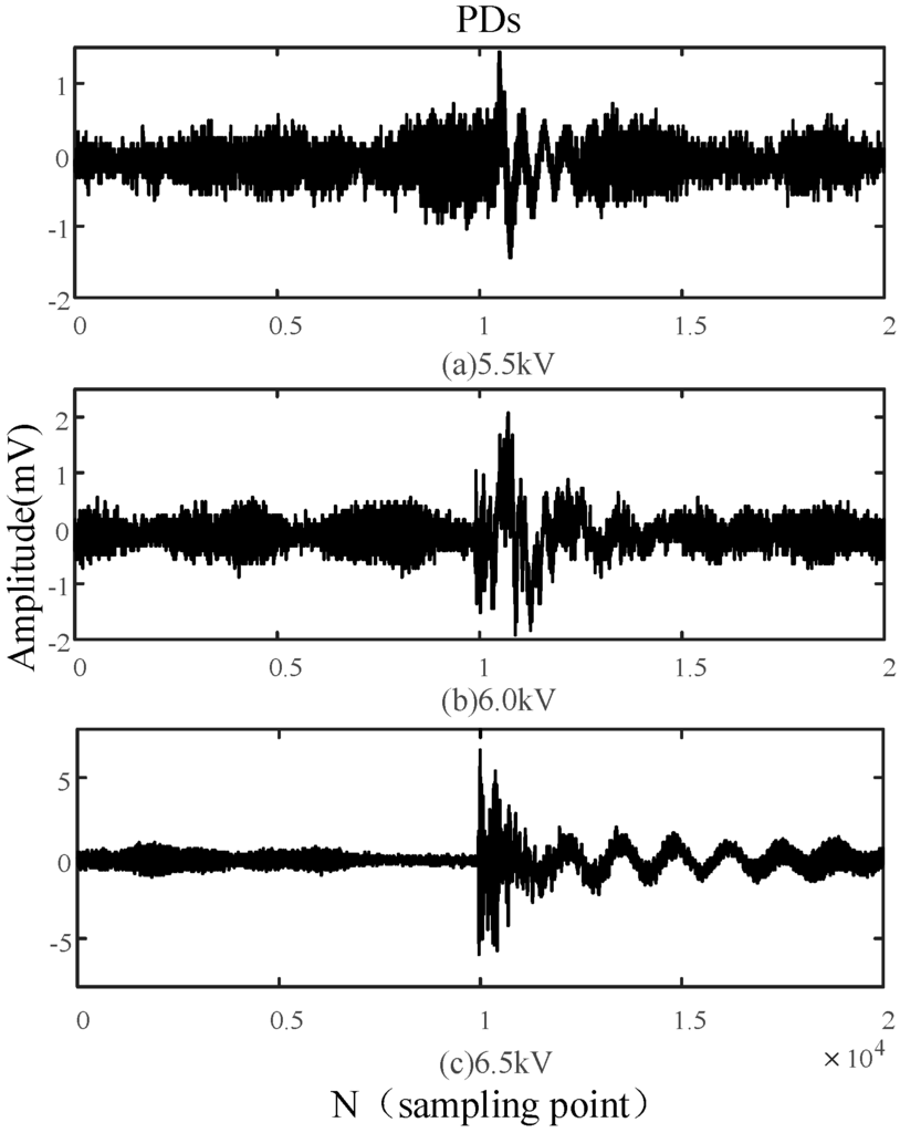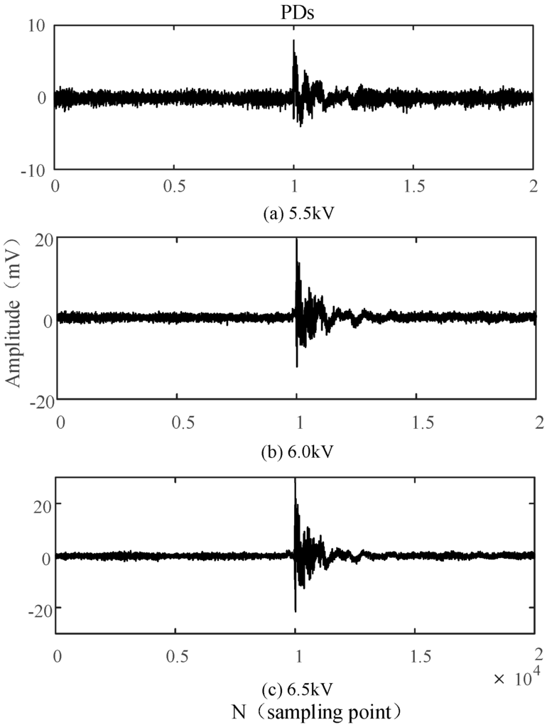 Figure 17 indicates that the amplitude of PDs in the positive half-period are significantly larger than that of PDs in the negative half-period under the same voltage conditions, and the magnitude of the PD amplitude increase is more obvious under the same conditions. Compared with the single PDs detected by the external antenna as shown in Figure 18, not only do PDs detected by the built-in sensor possess a larger amplitude under the same voltage conditions, but the amplitude variation of PDs is also more evident for the same voltage difference. These experimental results also show that the built-in antenna sensor possesses high detection sensitivity and strong anti-interference ability, and the external antenna sensor presents poor PD detection capacity because of the electromagnetic shielding effect of the all-metal casing and the interference from the electromagnetic environment.