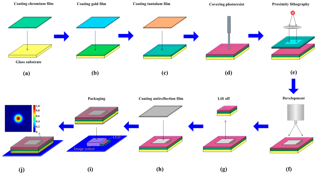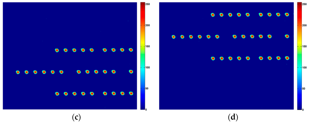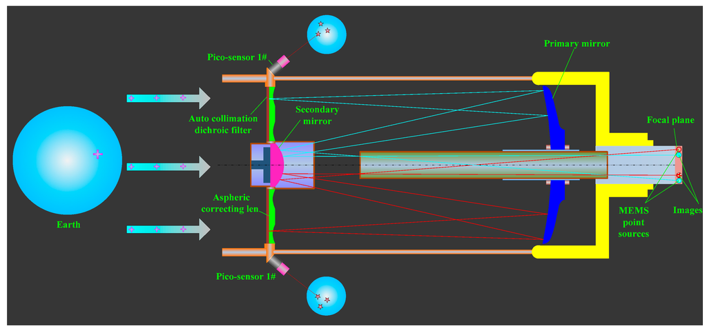 The fabrication process of the mask is as follows: (1) chromium, gold and tantalum materials are plated on a specified glass substrate; and (2) the photoetching process is performed on the metal layers to obtain several small apertures. The mask includes a glass substrate, a mask layer, and an anti-reflective layer, etc., and the mask thickness is 1.6 mm. The etched apertures in the mask can pass through light, while other parts cannot because they are covered by metal layers. Optical anti-radiation quartz glass is used as the substrate because it can block free space, background cosmic radiation. First, a layer of chromium is plated on the glass substrate. The layer of chromium can completely attenuate the light with its thickness of 75 nm, which depends on the transmissivity of the optical system; Second, the gold membrane is plated on the chromium layer. The gold membrane is a mask layer and its thickness is 200 nm; Third, the tantalum membrane is plated on the gold layer, which is a radiation protection layer, and its thickness is 60 nm; Fourth, the photoresist is poured onto the plated substrate by spin coating. A polymethyl methacrylate (PMMA) material is used as the photoresist in the fabrication process; Fifth, proximity lithography is performed to expose the photoresist through a photomask; Sixth, some developer is applied to remove the exposed photoresist to form the pattern on the plated substrate; Seventh, a laser is used to cut the plated substrate in order to complete the integrated packaging with a complementary metal oxide semiconductor (CMOS) sensor; Eighth, a second chromium layer is plated on the cut substrate, this layer is used as the secondary reflection prevention layer and its thickness is 75 nm; Ninth, LEDs are installed under the mask. Light can pass through the etched apertures. Given that other parts are covered by a chromium layer, they stop the incident light; Finally, the LEDs, the image sensor, and the mask are packaged into a point-source focal plane. In the MEMS focal plane, the wavelength of the MEMS point sources is determined by the dichroic filter. The MEMS point sources can be controlled by the SSPIAP controller in real-time. In the SSPIAP’s imaging mode, the LEDs can be switched off and have no effect on imaging. The MEMS light sources are installed around image sensors. Accurate positions of the MEMS light sources are calculated based on the relationships between the image sensors and the optical system. For the optical remote sensor, several image sensors are butted together into one greater image sensor [,]. The MEMS light sources are generally placed on the butting area.
