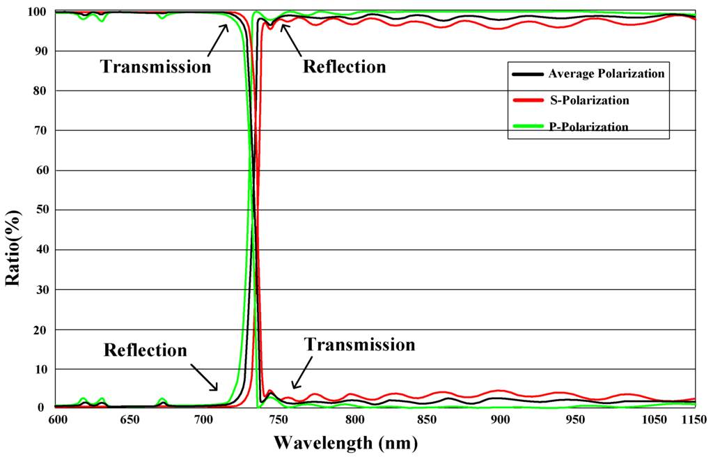 In the first step, an auto-collimation dichroic filter is used to complete the integrated imaging and calibration. The dichroic filter can selectively pass light in a small range of bands while reflecting light in other bands. Figure 2 shows the reflection and transmission ratios of the dichroic filter for the visible optical camera.