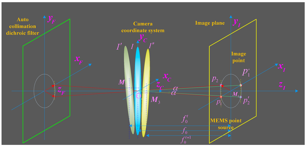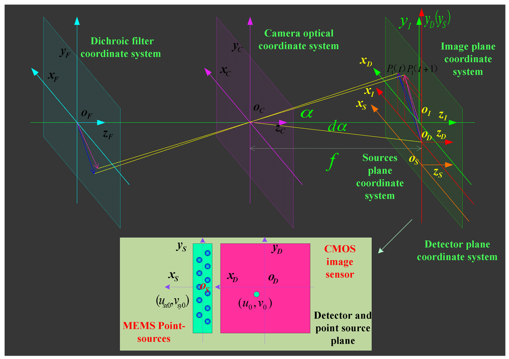In [], a coordinate transform method was used to build the relationships between ground object targets and image positions. This coordinate transform method can obtain the instantaneous imaging geometrical relationships of optical remote sensing sensors. In this study, we adopt this coordinate transform to build a mathematical model of point sources and their image positions to calculate the instantaneous principal distance and principal point. According to Figure 1, several coordinate systems from the MEMS point sources to the dichroic filter plane were defined as follows: dichroic filter plane coordinate system F(xF,yF,zF), camera coordinate system C(xC,yC,zC), image plane coordinate system I(xI,yI,zI), source plane coordinate system S(xS,yS,zS), and detector plane coordinate system D(xD,yD,zD). The coordinate relationships of equivalent optical paths between point sources and the image positions are shown in Figure 4.