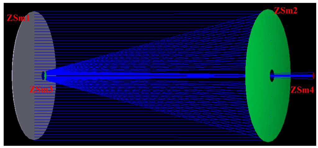 To verify the effectiveness of the proposed method, we used an optical design program, ZEMAX (Zemax, LLC, Bellevue, WA, USA), to simulate calibration experiments. In ZEMAX, our input optical system model parameters were as follows: the focal length was 2032 mm and the aperture diameter was 203.2 mm. The Cassegrain optical system was adopted. The optical system was composed of a primary mirror and a secondary mirror. Based on the optical system, a monitoring optical path of the principal distance and the principal point was designed. A tertiary mirror was used in addition to the secondary mirror. The optical rays are reflected from the mirror, go through the optical system again, and are then concentrated on the CMOS detector. The designed optical path is shown in Figure 6. In this figure, ZSm1 is a mirror that simulates the dichroic filter, ZSm2 and ZSm3 are the primary mirror and secondary mirrors, respectively, and ZSm4 is a focal plane that simulates the MEMS sources.