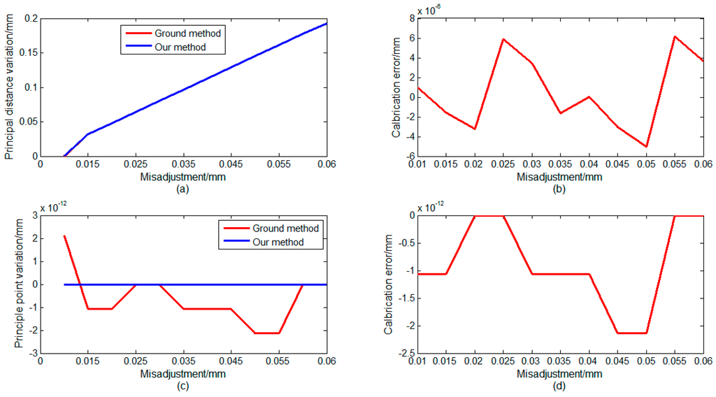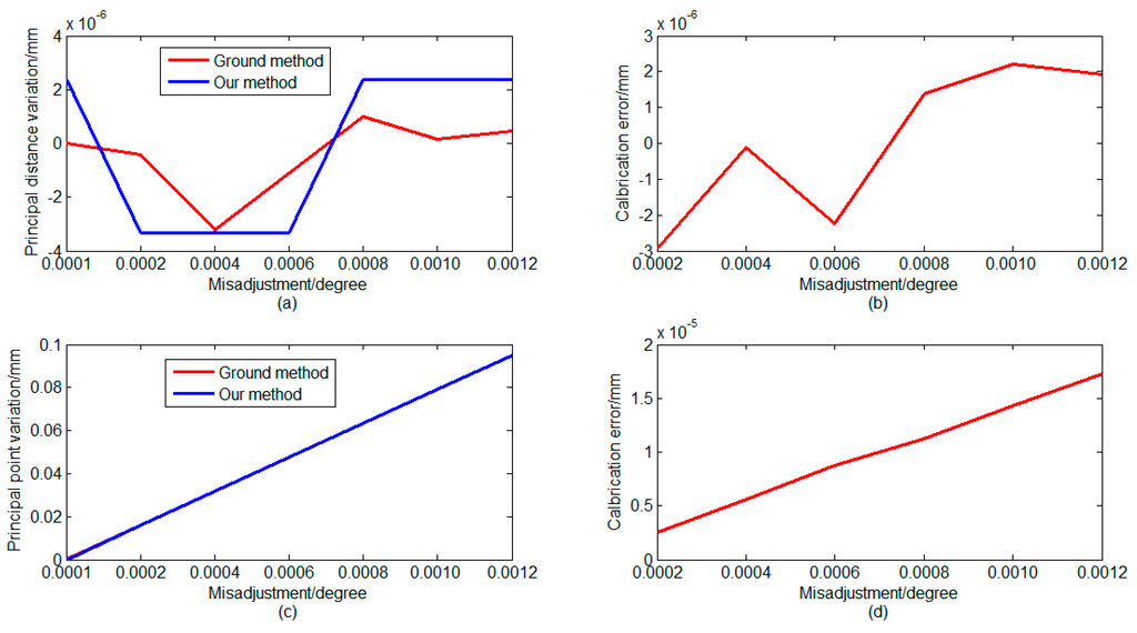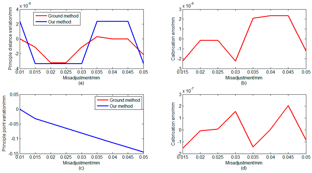 These results are due to the translation of the ZSm2 mirror away from the optical axis direction and also the inclination toward the optical axis direction. These cases can be equivalent to a mismatch between the primary mirror and secondary mirror in on-orbit working conditions. These phenomena happen during on-orbit dynamic imaging. As shown in Figure 8 and Figure 9, the error is less than 1 μm under the different maladjustments, this is acceptable. Table 1 and Figure 7, Figure 8 and Figure 9 show that our method can accurately calibrate the variation of the principal distance of the principal point. In Figure 7, Figure 8 and Figure 9, the calibration error is the difference between the two methods. In Figure 9, the calibration error shows a linear growth because the larger maladjustments make larger deformations of the optical system and the images. Compared with the error in the on-ground method, the error in our method is less than 1 μm.