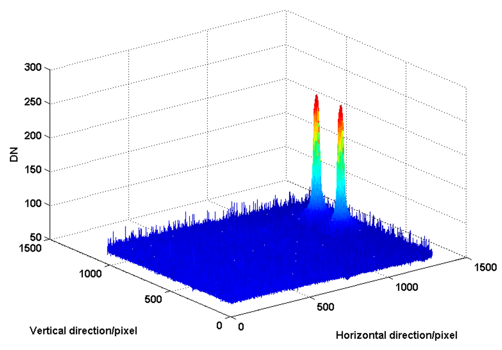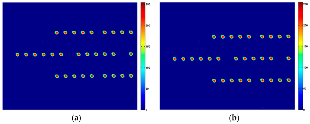 Secondly, we calibrated the principal distance and the principal point using our method. In the SSPIAP, the camera controller set the calibration mode and switched the MEMS point sources on or off. The MEMS point sources were lit when the camera controller executed the turn-on command. Figure 13 shows the captured images when two point sources were lit. Using the spot centroid algorithm, the position of images can be determined. The principal distance and the principal point were calculated according to Equations (12) and (13).