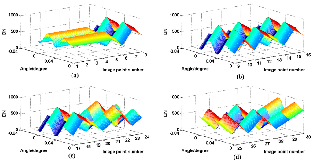 where N is the number of MEMS point sources. We used N equal to 2. In this case, the variation of the principal distance and point can be obtained as , and . α1, α2 and the positions of two point sources can be accurately calibrated at the adjustment stage of the SSPIAP. The positions of two point source images can be calculated by the centroid extraction algorithm. Therefore, the variations of the principal distance and point can be determined.