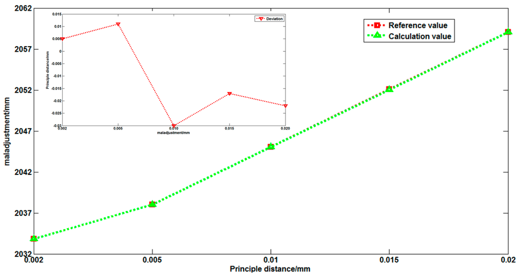Thirdly, we adjusted the motion of the secondary mirror to simulate on-orbit maladjustments of the optical system. From analyzing the maladjustments of different elements of the optical system, we know that the secondary mirror and primary mirror maladjustments have an effect on the focal plane of the optical system. Given that the primary mirror is installed in the primary mirror room, it has almost no maladjustment. Figure 14 shows the principal distance variation under different maladjustments. In addition, we used the ground calibration method based on a least squares, multiple regression analysis as reference. The calibration deviation was less than 0.015 mm. The deviation stems from the self-method error between methods under the maladjusted condition.