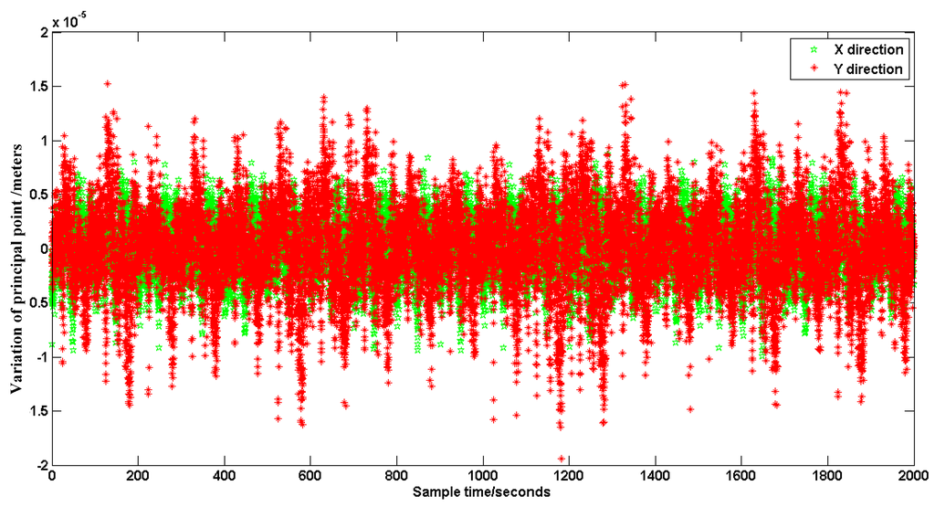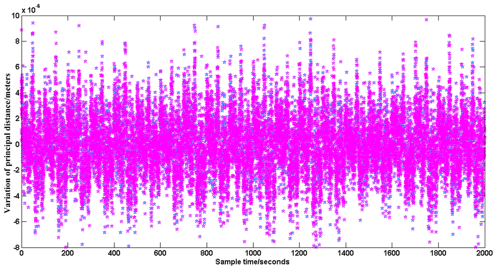 When the SSPIAP is working in a space environment, the centroid extraction and platform flutter temperature are the primary error sources. In the SSPIAP system, we designed a special thermal control system to maintain minimal changes in the temperature field of the optical system. Further, we use a manganin material in a structure designed for vibration attenuation in the SSPIAP. The vibration attenuation structure can significantly reduce the influence of flutter on the optical system. The centroid extraction error mainly depends on the centroid extraction algorithm. The extraction accuracy of our method is less than 0.05 pixels. In our SSPIAP system, the pixel size of the image sensor is at the micrometer level. Thus, the extraction accuracy is less than 1 μm, and the error is acceptable for the requirement of errors less than 50 μm. To test the monitoring accuracy of our method in an approximation to the on-orbit environment, our experiment was performed in a laboratory with constant temperature. Furthermore, the experimental turntable used a gas-floating vibration isolation platform to avoid vibration disturbance. We used our method to monitor the variation of the principal distance and the principal point in the static case. We processed tens of thousands of images to calculate the monitoring accuracy. The variation of the principal distance in 2000 real-time seconds is shown in Figure 15, while the corresponding variation of the principal point position is presented in Figure 16.