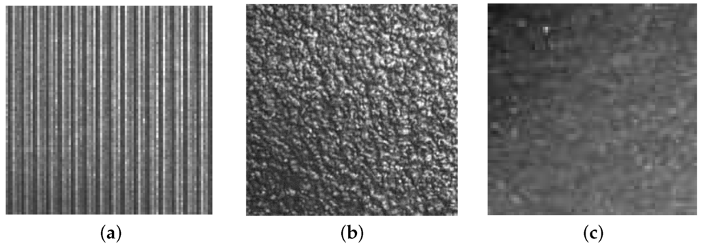 Figure 7 shows representative images of statistical (Figure 7a,c,d) and structural (Figure 7b) textures. The first two images represent a pattern with high horizontal and vertical directionality respectively, while the other two images present a statistical texture with a coarse-to-fine appearance.
