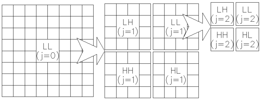 Wavelet transform can be applied on an image in 256 gray levels and of size by means of a convolution (linear, periodic or cyclic), through two filters (a low-pass filter: L; and a band-pass filter: H), and by taking, from the resulting image, a sample out of two. This process is applied to all the rows, and then, with the resulting rows to all of the columns, provides four subimages defined as (L filter on rows and columns), (H filter on rows and L filter on columns), (L filter on rows and H filter on columns) and (H filter on columns and rows). These four subimages share the same origin, and their size is a quarter of the original size. One of them () is referred to as the approximation subimage. It is defined as and represents an approximation of the original image. The other three subimages are referred to as detail subimages: horizontal detail subimage or ; vertical detail subimage or ; and diagonal detail subimage or . According to this notation, the original image can be represented in this way: .