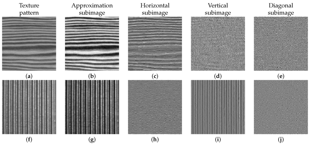 Texture patterns (a,f) and subimages of the first wavelet decomposition levels for directional textures: aproximation (b,g); horizontal (c,h); vertical (d,i); and diagonal (e,j).