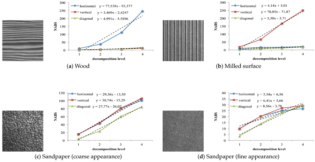 The graphs to right of each image show the NABS values of the horizontal, vertical and diagonal details (, , ) as a function of the decomposition level . Analysis of the graphs shows considerable differences between the NABS values for the high directionality texture patterns and for no directional patterns. This difference is very noticeable in each of the trend line equation slopes, which were obtained using the least squares approach.