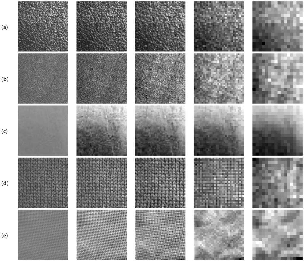 Approximation subimages () of four wavelet decomposition levels for different textures. (a) Sandpaper (course appearance); (b) sandpaper (fine appearance) and (c) painted-surface: statistical textures; (d) fabric (course appearance) and (e) fabric (fine appearance): structural textures.