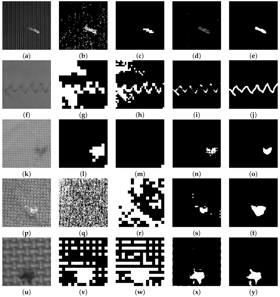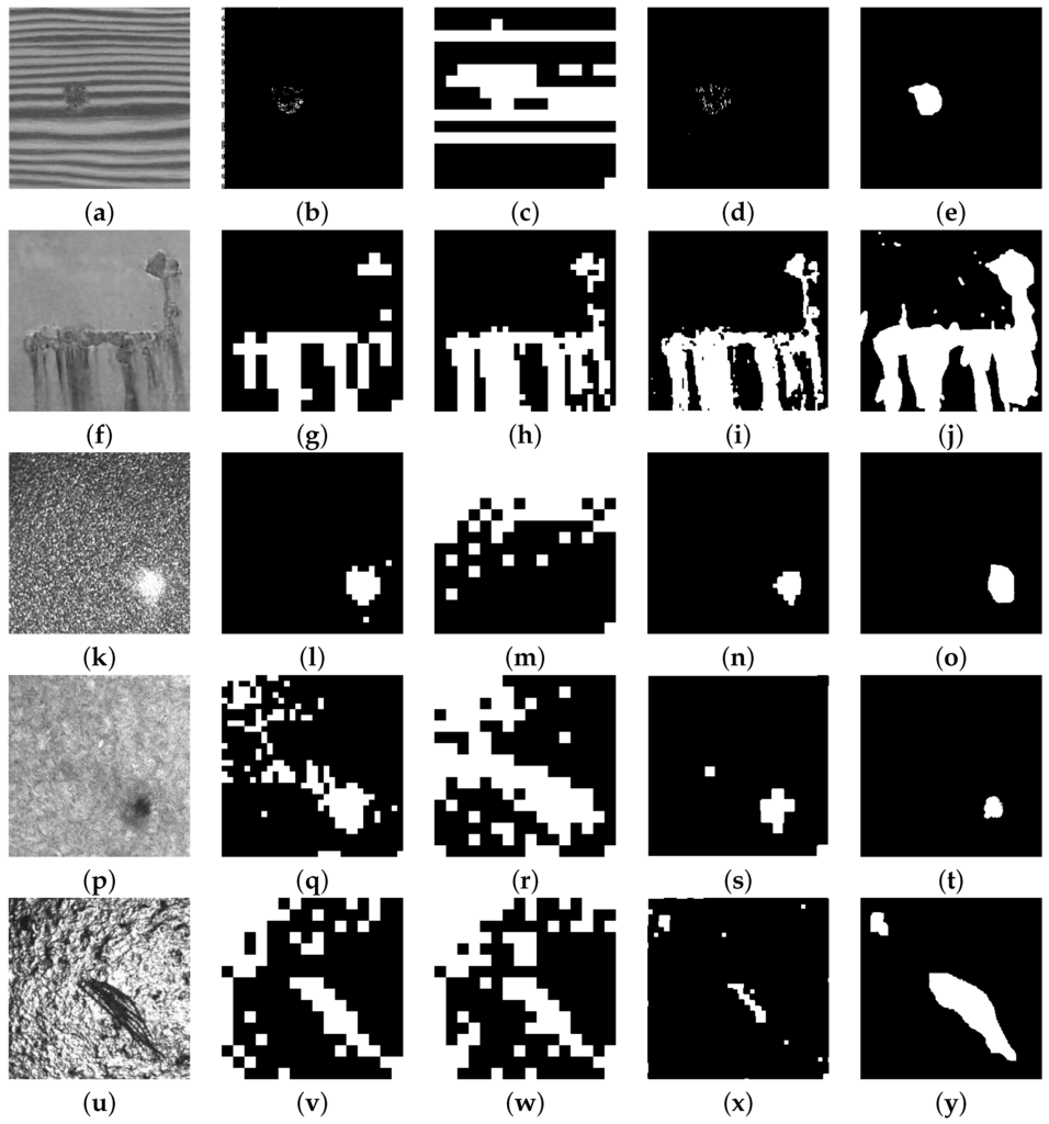 Defects in different structural texture. (a) milled surface, (f) fabric fine-appearance, (k) fabric medium-appearance, (p) fabric coarse-appearance and (u) bamboo weave; (b,g,l,q,v) are the images resulting from the Tsai method; (c,h,m,r,w) are the images resulting from the Han method; (d,i,n,s,x) are the images resulting from the EADL method; (e,j,o,t,y) are the ground-truth images resulting from segmentation carried out by human inspectors.