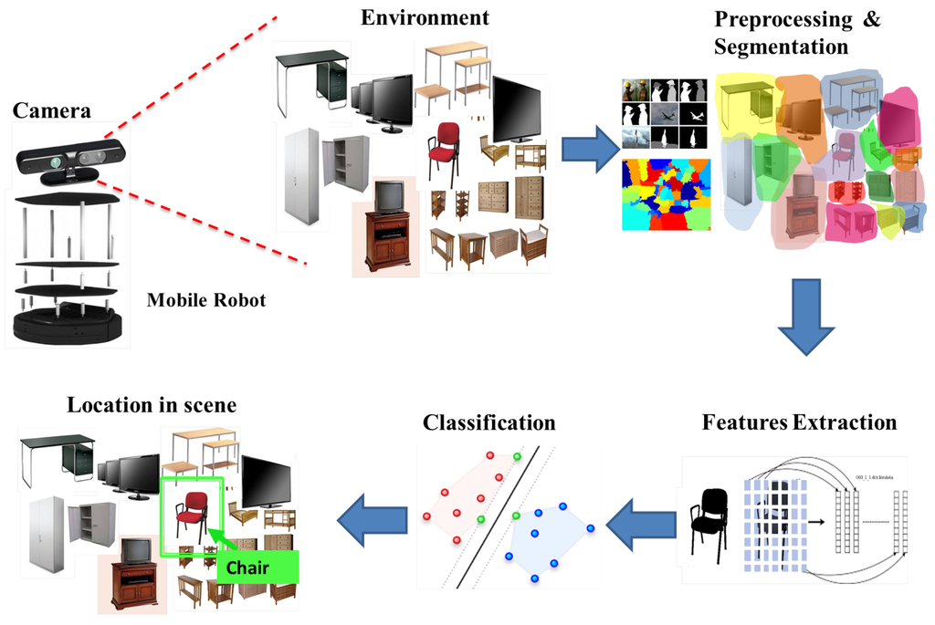 Among the most important stages of an object detection system is the image segmentation [10]. There are many image segmentation techniques, some of them are based on color [11,12]. In [11], a method is proposed that uses depth segmentation techniques and processes the color and depth images provided by the Kinect sensor. In the process, a color segmentation to detect only red chairs is performed, creating an initial mask allowing objects of the same color to be extracted. One disadvantage of this type of method is that the segmentation based on color is susceptible to changes in illumination. In our work, a combination of different segmentation techniques that do not involve color information is implemented; in this way, problems related to changes in lighting are eliminated, making our algorithm more general to detect different objects, irrespective of color. Other approaches use 3D information for point cloud segmentation, as the work of [13]. They present an approach to localize planar furniture parts in 3D range camera data. The segmentation method uses shape information to detect chairs with elliptical shapes. This approach is designed for specific objects (elliptical chairs), so generalizing the algorithm to other objects can be difficult. In our work, we propose to use the geometric information without focusing on a particular shape, but combining features that distinguish one object from another in a better way.