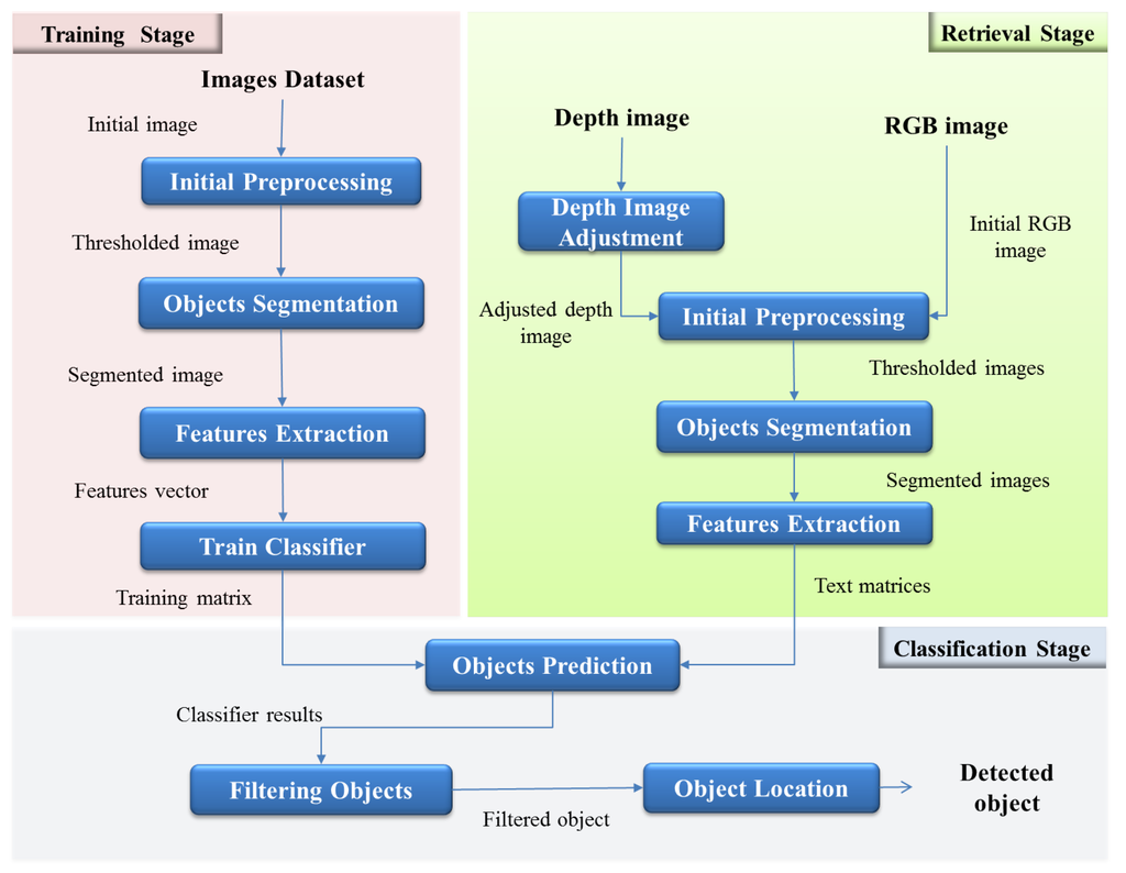 In the second stage, the retrieved image preprocessing is performed. This process is conducted entirely online, and real-time images in different formats, color RGB and depth images are taken. It is necessary to make an adjustment process for depth images to remove noise and invalid pixels. Then, both depth and RGB images are sent to the preprocessing step, which is similar to the preprocessing of the training stage. Subsequently, the segmentation is applied to both images, and features from each isolated object are extracted. The final goal of using different types of segmentation and feature extraction methods is to evaluate functionality and to compare the results.