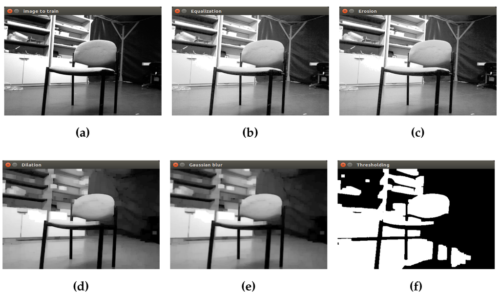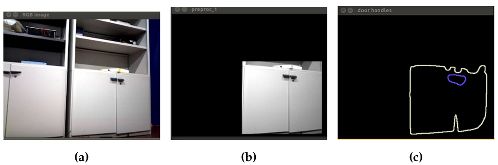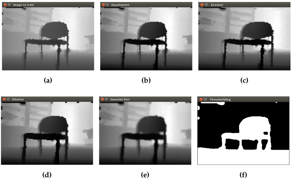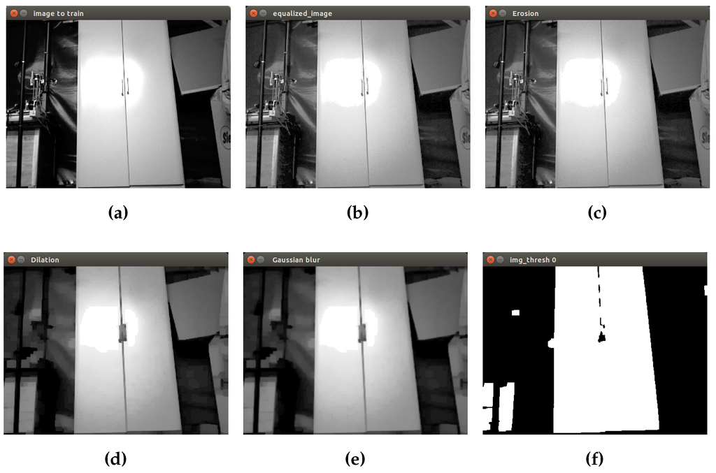 Finally, a binary image as input to the next step is obtained. In Figure 5, the process to prepare the closet object is shown. The first image corresponds to the initial grayscale image Figure 5a. Then, equalization, erosion and dilation are applied to remove small objects in the scene. The Gaussian filter is applied in order to reduce image noise and details using a 3 × 3 kernel value. Finally, in the last picture, the isolated closet can be seen by converting the grayscale image into a binary image.