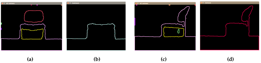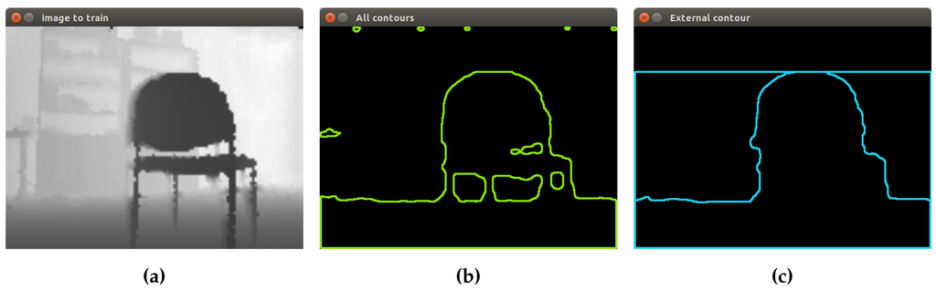 The image format used to process the chairs is the depth image. Hence, the first segmentation process is based on contours’ extraction. OpenCV offers a function called findContours, which retrieves contours from the binary image using the algorithm proposed by [21]. This function uses as input the following parameters: input image, output vector contours, hierarchy vector, contour retrieval mode and contour approximation method.