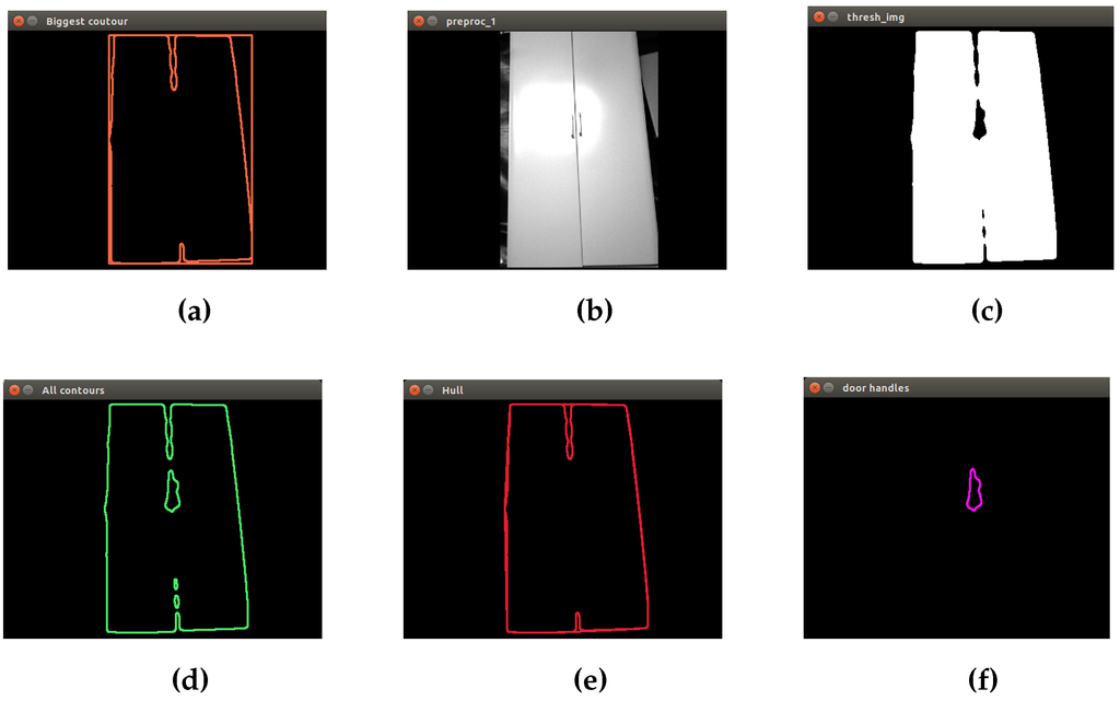 Closet segmentation: second algorithm. (a) The biggest contour of the image; (b) result of applying the binary mask in the input image; (c) thresholding operation; (d) extraction of all contours; (e) extraction of the external contour; (f) extraction of the possible door handles.