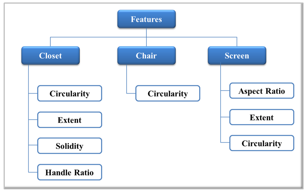 In this approach, the idea is to find features invariant to rotation, translation and size. According to the selected objects, different geometric features have been chosen. The combination of these features allows one to discriminate shapes and must be able to define and differentiate each object. In Figure 10, a diagram with the selected features for closets, chairs and screens is shown. In the case of the closet object, solidity, extent and circularity are relative to the shape of the object. Additionally, to ensure a better differentiation of the object, a fourth feature, called handle ratio, has been created. Handle ratio is a feature that represents a value defined between and when the door handle appears in the image. If the door handle can not be detected, the ratio assigned is between and .