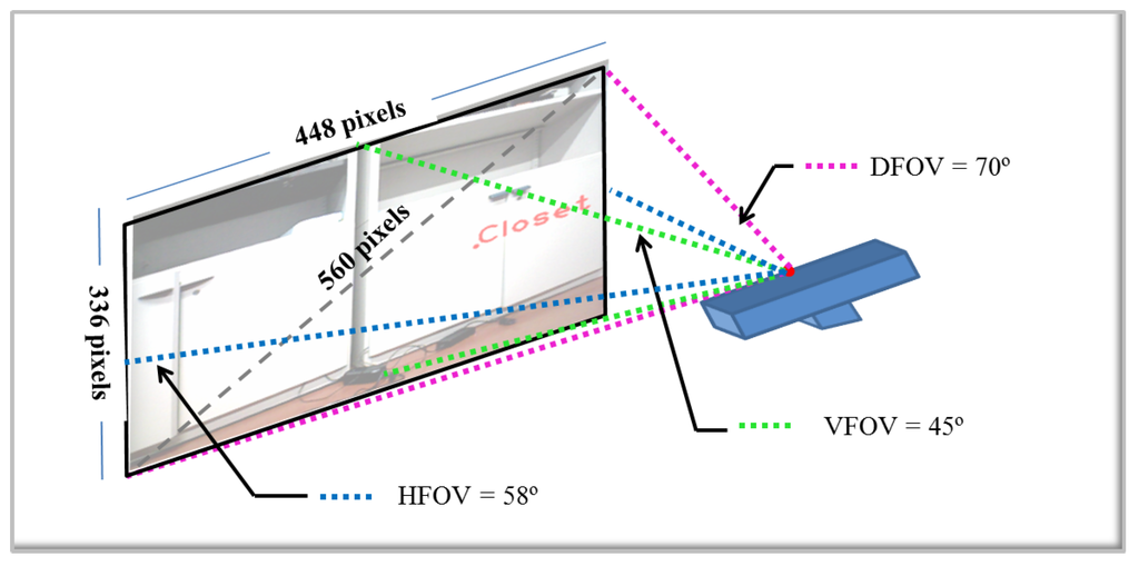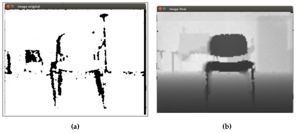 Initially, through the subscription to Robot Operating System (ROS) topics camera/depth/image and camera/rgb/image_color, real-time depth and RGB images are obtained. Topic camera/depth/image contains a 2D depth matrix containing point distances in meters encoded as a 32-bit float. In this case, the sensor used is an ASUS Xtion pro Live that operates within a range of distances from m to m. Converting depth values to the range of an uchar (eight bits) is necessary. Depth images of ASUS Xtion pro Live suffer from the problem of poor accuracy caused by invalid pixels, noise and unmatched edges [24]. The non-finite value (NaN) denotes an invalid depth. For this reason, several techniques have been applied to improve the quality of the image: