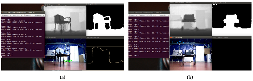 In Figure 21a, on top, the adjusted depth image is observed; on the right, the thresholded image; in the lower right corner, the result of the segmentation process; and in the center, the image with the detected object. The name of the object is in the center of mass of the extracted contour. On the other hand, in Figure 21b, the chair could not be detected, because the legs could not be segmented from the depth image; because of this, in the lower right corner, the contours cannot be displayed.