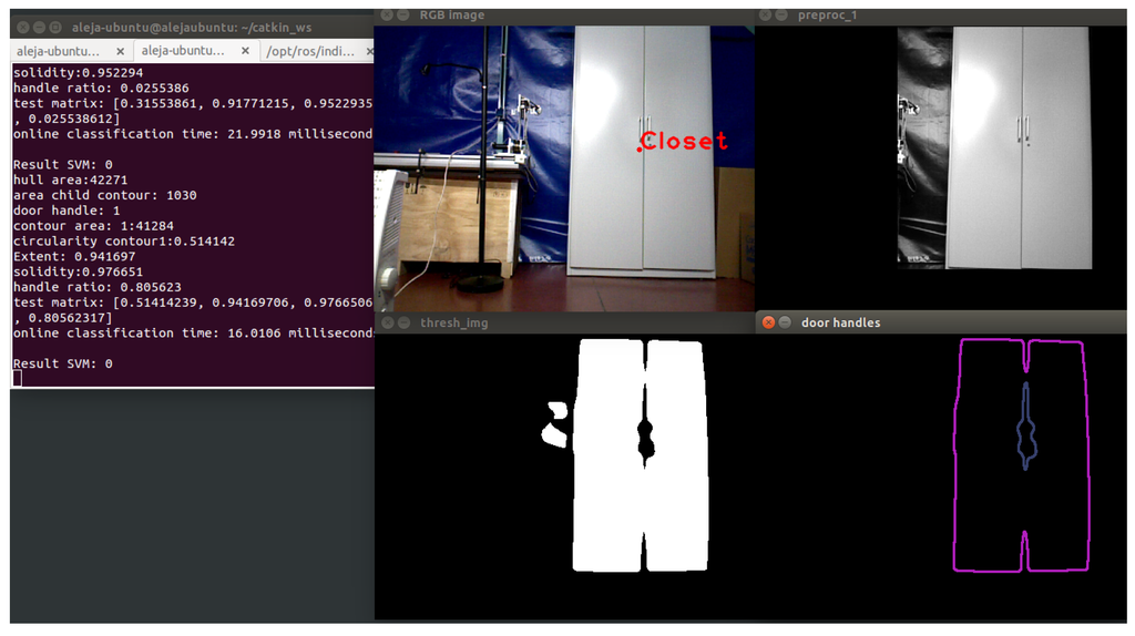 The higher right corner shows the mask created in the initial segmentation. Then, the object is isolated, and using techniques of contour extraction, the biggest contour and the inside contour are obtained. The inside contour represents the door handles of the closet.