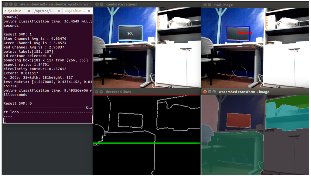 For the chair object, major efforts have been made to reach a better segmentation; therefore, only one feature (circularity) is needed to define this object. Regarding the screen object, three features, circularity, extent and aspect ratio, have been chosen. One of the most important features of screens is the aspect ratio. With each set of features, a training matrix is created. Each row corresponds to one image. Each element in that row corresponds to one feature of the class. Additionally, a label vector with the number of the corresponding class is created.