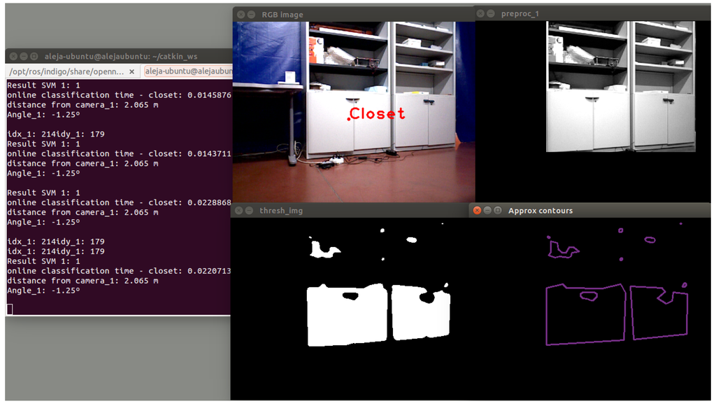 The final stage consists of predicting the objects in the real-time images. For this, test matrices are created with features extracted, and SVMs use this along with training information to classify the object. Next, filters are applied to make a decision according to the results of the SVMs. Finally, a process to locate the detected object in the scene is performed. The center of mass of the object is calculated, and depth information is used to determine the distance and angle from the center of the camera. This information is encapsulated and prepared to be sent to other systems with the objective to contribute with navigation tasks and high level tasks concerning places’ categorization and semantic navigation.