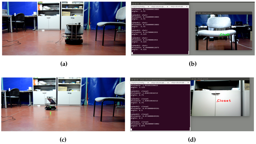 A total of 75 frames were taken for testing, divided into 24 frames with different types of closets, 21 frames with chairs, 11 frames with screens at different angles and 19 frames with other objects of the selected environment. The results show that the highest model accuracy is for closets, with followed by screens with and chairs with . The highest misclassification rate is for chairs with and screens with . Sometimes, if the robot perceives the chair back, the system is unable to detect it. In the case of the closets, when the robot is more than three meters away from the object, it cannot be detected.