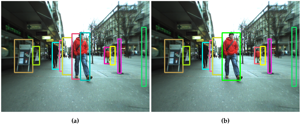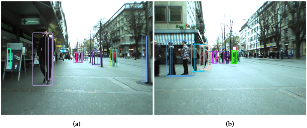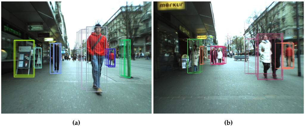 Object tracking can be divided into online systems (for which tracking is done on a frame-by-frame basis), or offline systems (which take longer sequences into account), like in [21,22]. In the online systems, targets are usually followed using classic tracking approaches, like the Extended Kalman Filters (EKFs) [23], particle filters [24] or mean-shift tracking [25]. In [26], a simultaneously detection and trajectory estimation over a hypothesis test model extended with stereo depth and visual odometry is presented. Some solutions try to model the social behavior of the pedestrians in order to improve the obtained tracks, as happens in [27,28,29]. Other approaches use an intermediate solution between online and offline systems, like the Multi-Hypothesis Tracking (MHT) [30] or the Joint Probabilistic Data Association Filters (JPDAFs) [31].