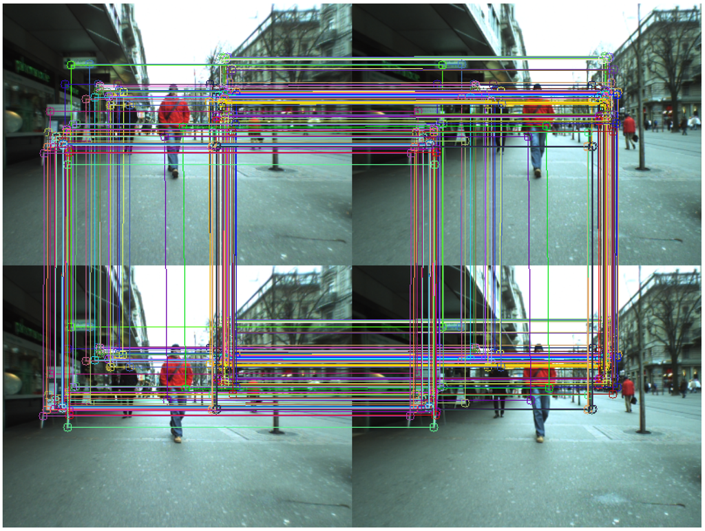 where and are homogeneous representations of corresponding image points in the left image of frames t and . Correct correspondences must be obtained in order to yield F, so they are computed in the following order [17]: , where is the left (L) or right (R) image in frame t. From an initial set of features in , valid matches in are obtained. The cycle is complete when is reached, keeping only valid matches. Figure 6 shows the results of the matching process, where each matching cycle is represented by the same random color. A match is valid if the following holds: