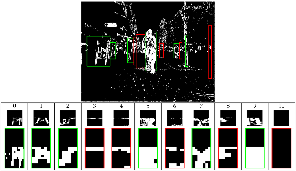 Sometimes, stixels are located at a depth different from their real position, as shown in Figure 5a where the legs of a person in the foreground are separated enough to show the ground between them. This confuses the detection process, which regards the obstacle’s base as the central part of this person and not his feet. The process described in Algorithm 2 reduces this effect.