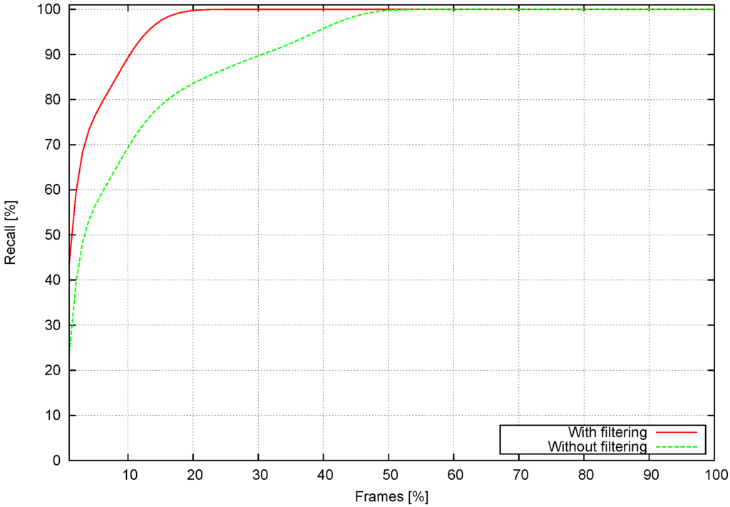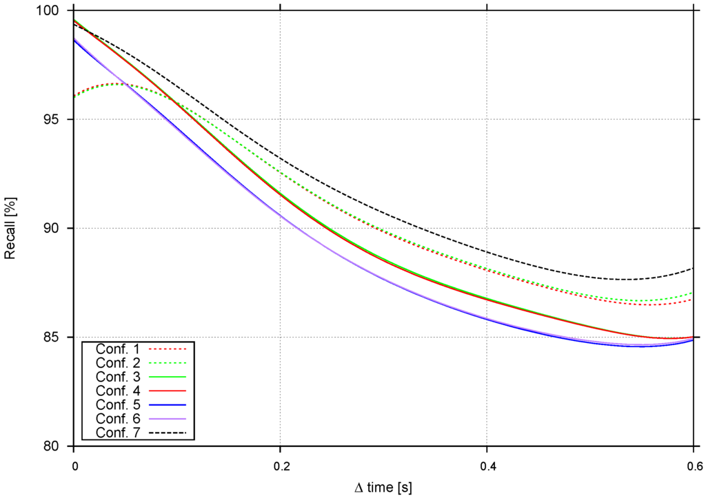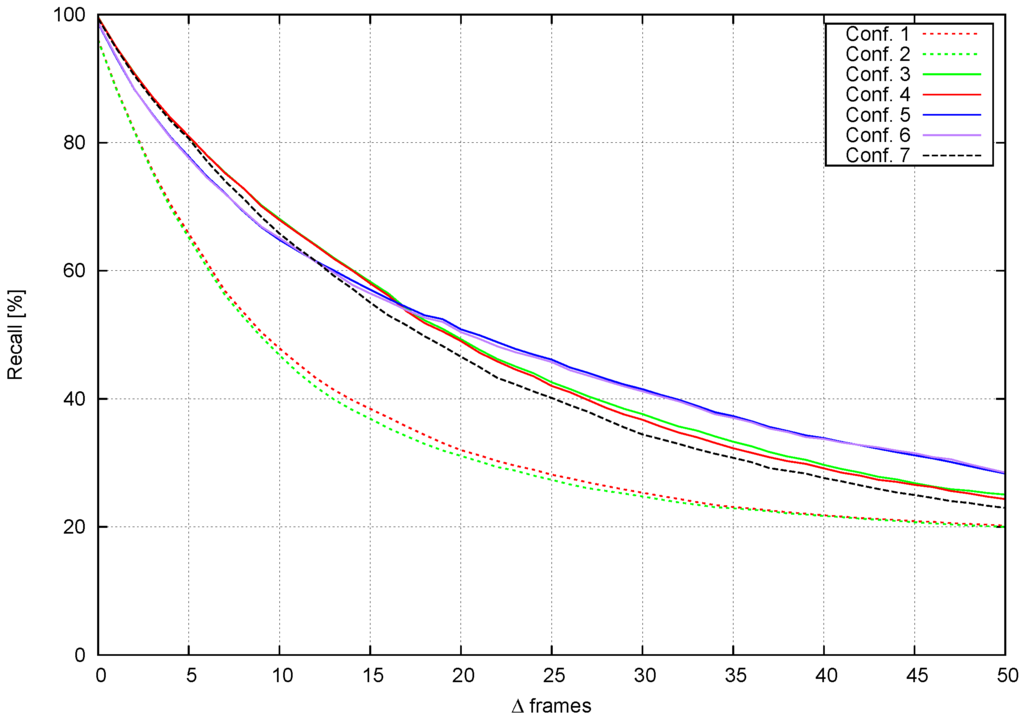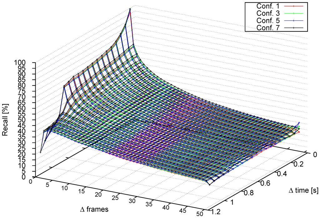 Figure 18 compares recall, Δ frames and Δ time for Configurations 1, 3, 5 and 7. When Δ frames , the pattern shown in Figure 17 is repeated. However, when Δ frames starts to increase, Configurations 3 and 5 do not fall as fast as Configuration 1, which confirms the conclusions drawn from previous tests. Configuration 7 achieves a higher recall than the other configurations.