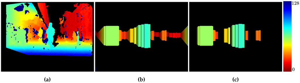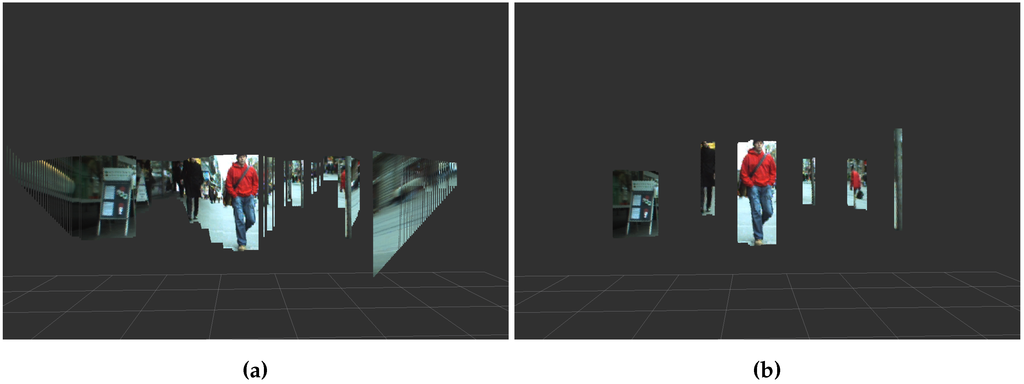 are the stixels in current frame t. From left to right, stixels are accumulated until the depth difference between stixels is greater than . When the right border of an obstacle is reached, it is added to , and the clustering process starts for new obstacles. If an obstacle is not wide enough, it will be rejected. Stixels generated due to noise, as shown in Figure 1, are removed. also includes parameters, such as object depth, which is computed as the minimum depth between all of the clustered stixels. Figure 5a shows the results after clustering.